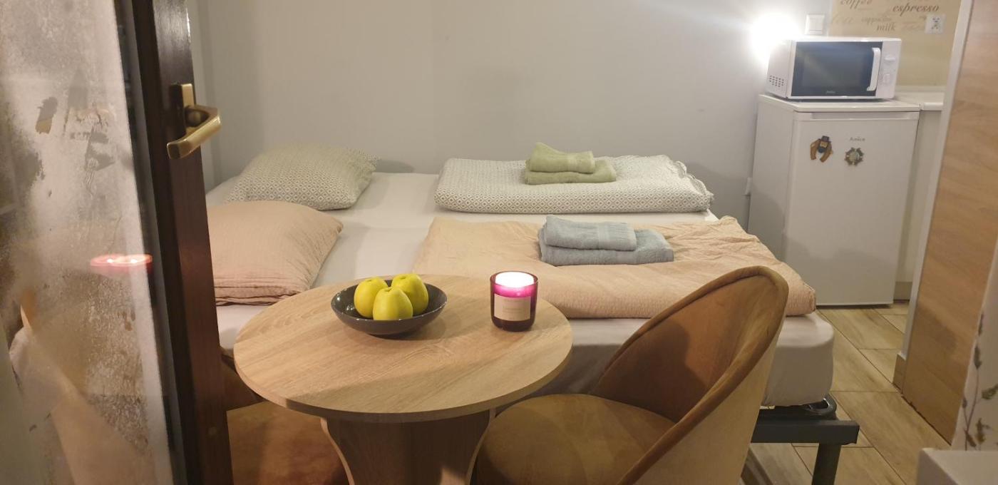 W apartamencie zapewniono sypialnię (1) oraz aneks kuchenny z lodówką, mikrofalówką i czajnikiem.