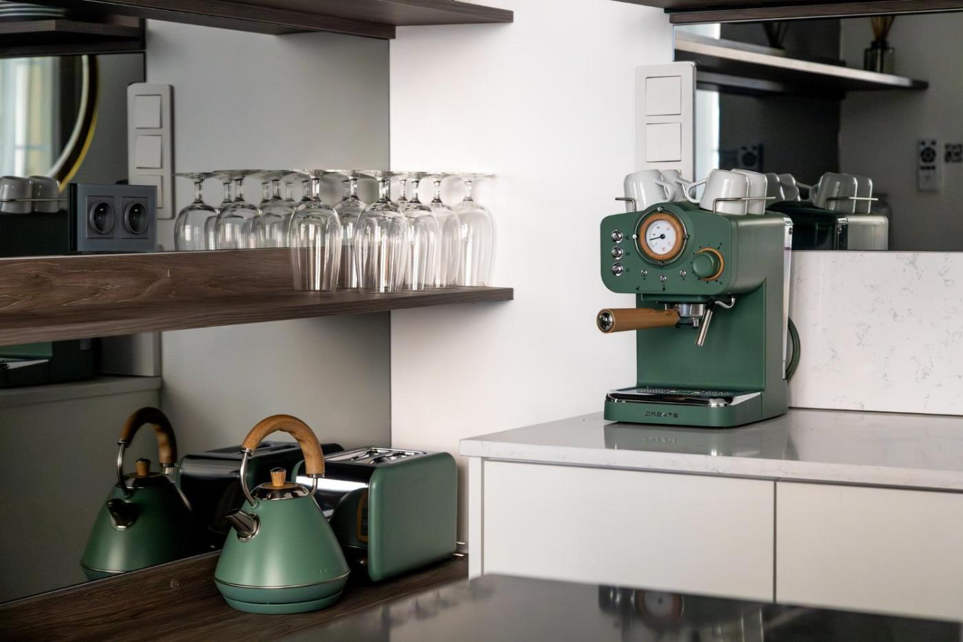 Oferta apartamentu obejmuje sypialnię (1), salon, aneks kuchenny z pełnym wyposażeniem, w tym lodówką i ekspresem do kawy, a także łazienkę (1) z prysznicem oraz suszarką do włosów. W apartamencie zapewniono ręczniki i pościel.